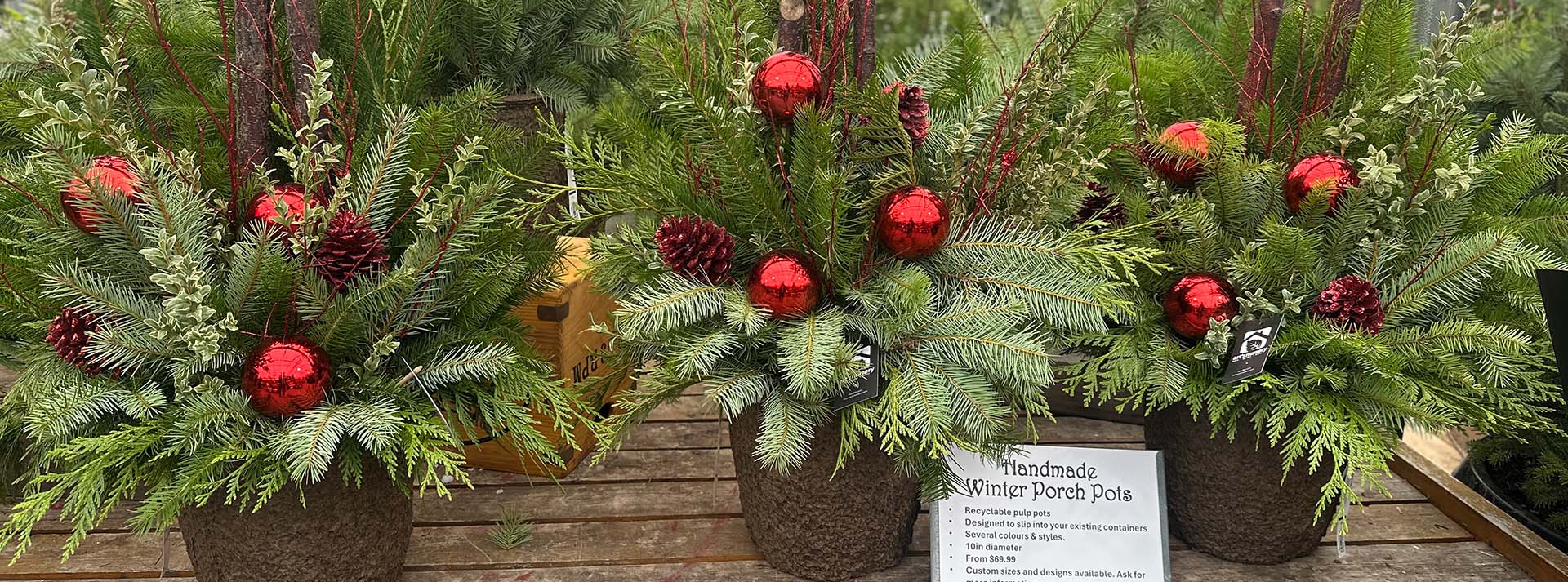 Winter porch pots come in several styles and color accents, including red, gold, silver, natural, or glitter. Interested in creating your own? Check out our workshop page for upcoming events.